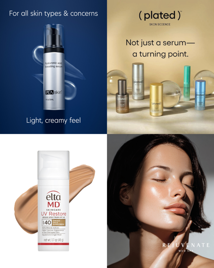 Our medical-grade skincare collection at Rejuvenate Med Spa in McAllen, TX includes Plated™ Exosome Skincare, which uses advanced platelet-derived exosome technology to support skin regeneration and post-procedure recovery; PCA Skin®, a science-based professional skincare line formulated to address concerns such as aging, hyperpigmentation, acne, and skin texture; and EltaMD®, a dermatologist-recommended brand known for broad-spectrum sun protection and gentle, effective formulations that help protect and maintain healthy skin. Each product line is carefully selected and recommended by our Registered Nurses to deliver safe, results-driven skincare tailored to your individual skin needs.